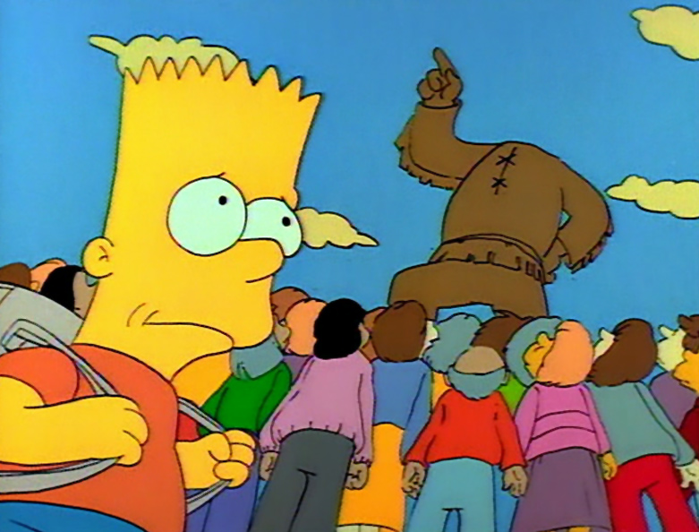 The next day, all of Springfield grieves the decapitation of the town founder. Bart finds Jimbo and his pals and discovers they are as distraught as everyone else. Feeling remorse, Bart returns home and confesses to his family. As Homer escorts Bart to the authorities, they are confronted by the angry mob. Bart tells the crowd that his act has united the town and taught people to appreciate their heritage. The townspeople agree, and Bart is forgiven. |
